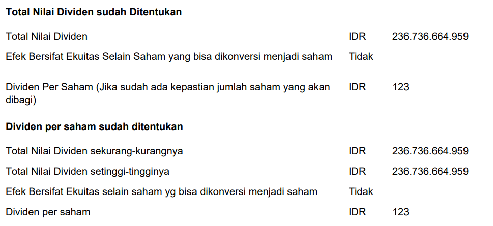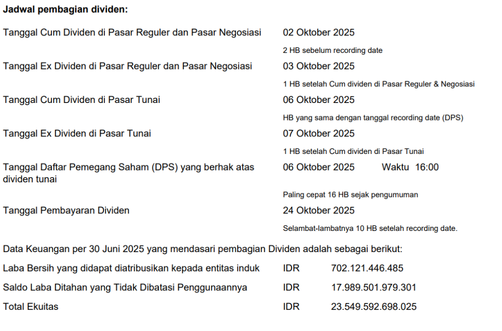 Perseroan menyampaikan rencana pembagian Dividen Interim untuk periode tahun buku 2025 Sesuai dengan keputusan Direksi yang telah disetujui Dewan Komisaris pada tanggal 22 September 2025 dengan rincian Dividen Interim yang akan dibayar sebagai berikut