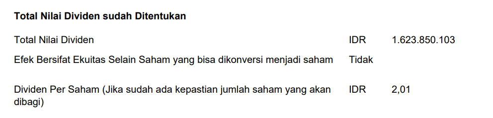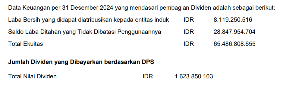 Pembagian Dividen Tunai untuk periode tahun buku 2024 sesuai dengan hasil RUPS Tahunan sebagai berikut: