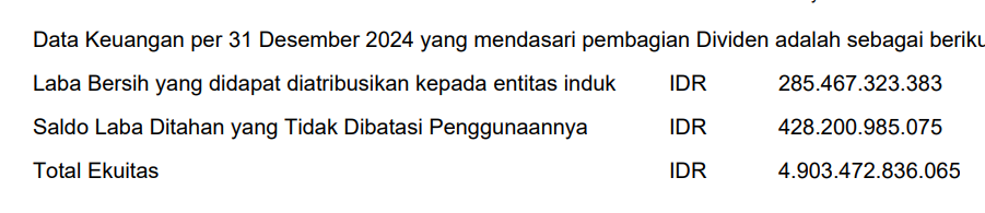 Pembagian Dividen Tunai untuk periode tahun buku 2024 sesuai dengan hasil RUPS Tahunan sebagai berikut: