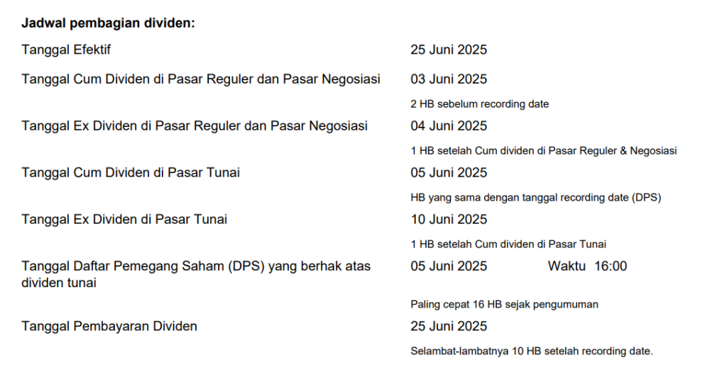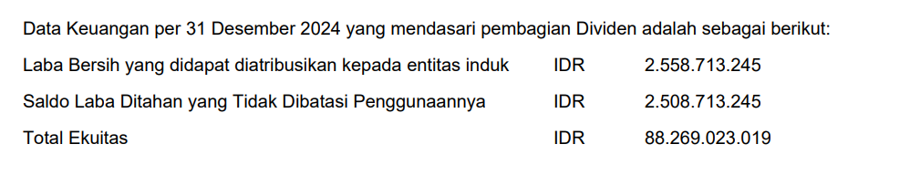 Pembagian Dividen Tunai untuk periode tahun buku 2024sesuai dengan hasil RUPS Tahunan sebagai berikut: