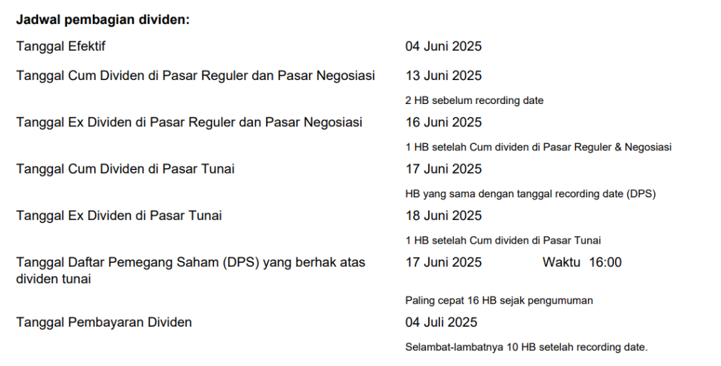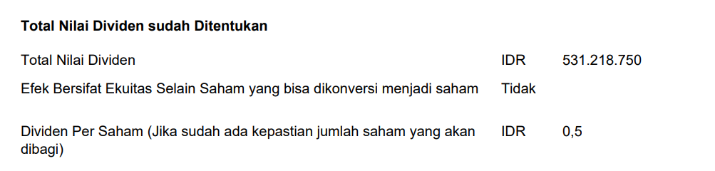 Pembagian Dividen Tunai untuk periode tahun buku 2024 sesuai dengan hasil RUPS Tahunan sebagai berikut: