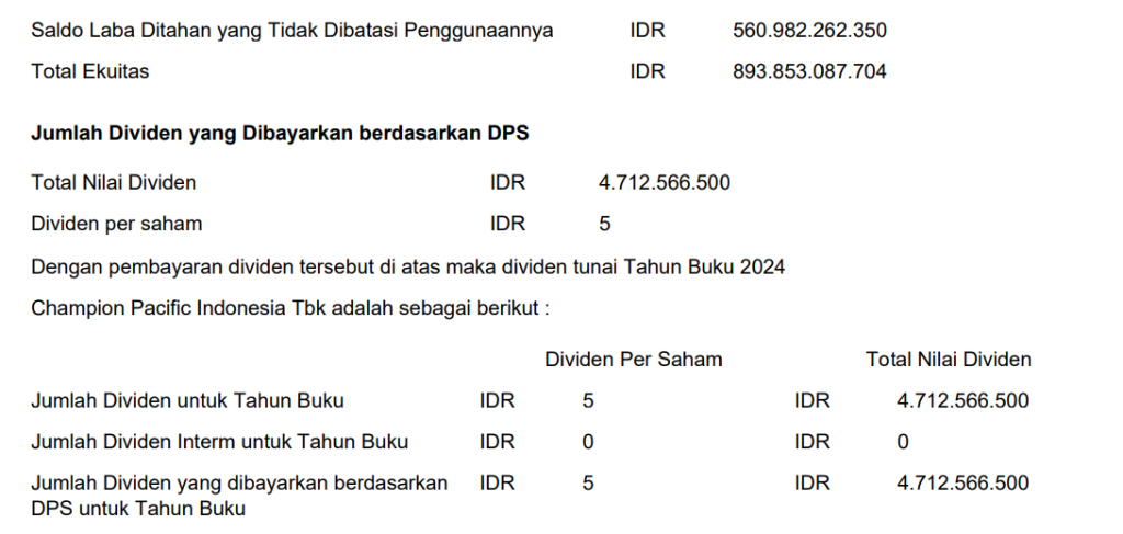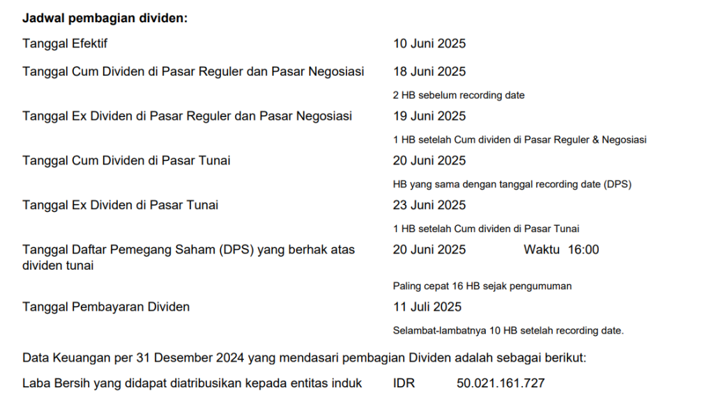 Pembagian Dividen Tunai untuk periode tahun buku 2024 sesuai dengan hasil RUPS Tahunan sebagai berikut: