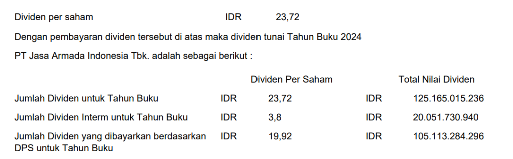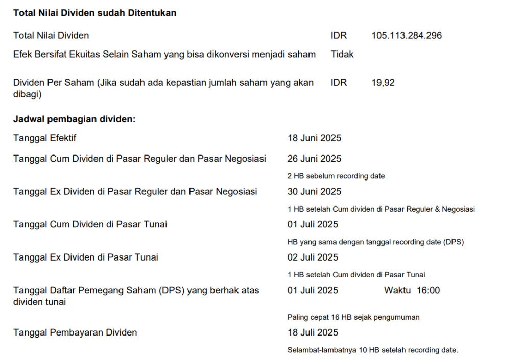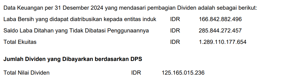 Pembagian Dividen Tunai untuk periode tahun buku 2024 sesuai dengan hasil RUPS Tahunan sebagai berikut: