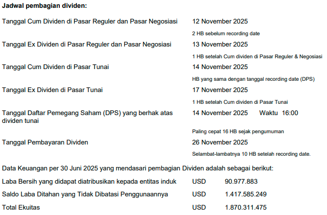 Perseroan menyampaikan rencana pembagian Dividen Interim untuk periode tahun buku 2025 Sesuai dengan keputusan Direksi yang telah disetujui Dewan Komisaris pada tanggal 31 Oktober 2025 dengan rincian Dividen Interim yang akan dibayar sebagai berikut :