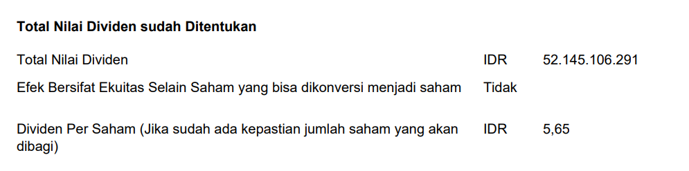 Pembagian Dividen Tunai untuk periode tahun buku 2024 sesuai dengan hasil RUPS Tahunan sebagai berikut: