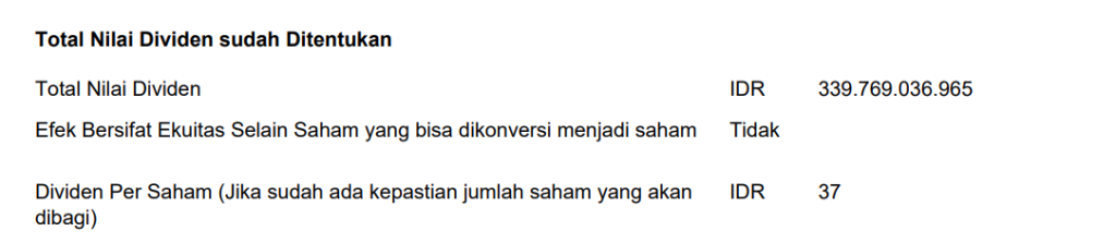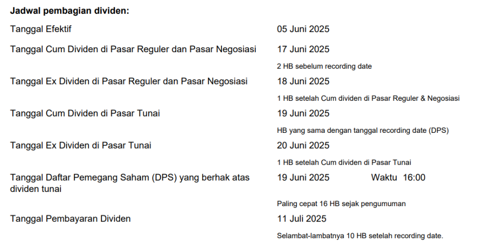 Pembagian Dividen Tunai untuk periode tahun buku 2024 sesuai dengan hasil RUPS Tahunan sebagai berikut: