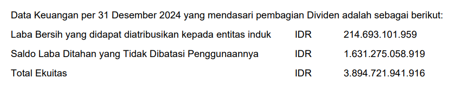 Pembagian Dividen Tunai untuk periode tahun buku 2024 sesuai dengan hasil RUPS Tahunan sebagai berikut: