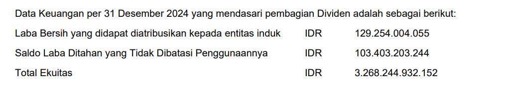 Pembagian Dividen Tunai untuk periode tahun buku 2024 sesuai dengan hasil RUPS Tahunan sebagai berikut: