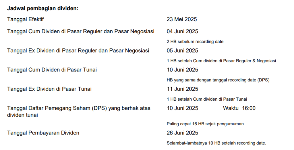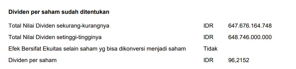 Pembagian Dividen Tunai untuk periode tahun buku 2024 sesuai dengan hasil RUPS Tahunan sebagai berikut: