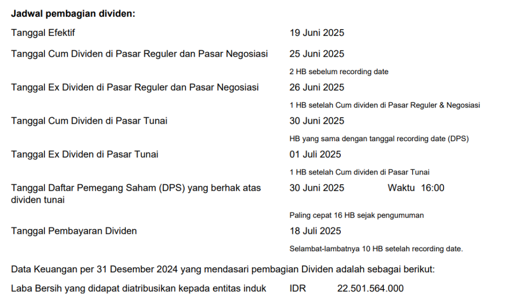 Pembagian Dividen Tunai untuk periode tahun buku 2024 sesuai dengan hasil RUPS Tahunan sebagai berikut: