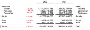 - segmen penjualan industri (73,33%) sebesar Rp1,41 triliun yang meningkat 20,07% secara tahunan.