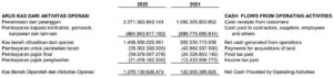 Arus kas operasional yang positif dan meningkat dibandingkan tahun sebelumnya ini menunjukkan bahwa perusahaan telah melakukan aktivitas bisnis intinya dengan baik. Memang tahun 2021 dampak pandemi masih terasa sehingga wajar jika memang 2021 tidak maksimal hasilnya.