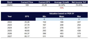 Dengan estimasi PBV 1,59 dan nilai buku hanya tumbuh 5% saja di 2023 maka 198 menjadi angka yang wajar untuk DMAS.