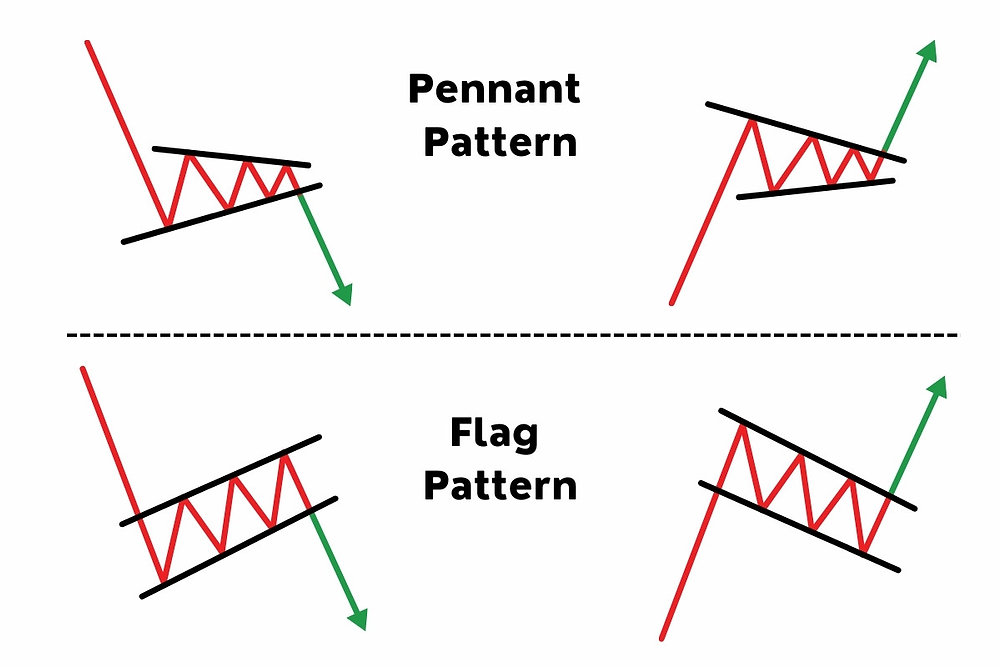 Untuk pola keberlanjutan (continuation), investor sering memperhatikan pola Flag dan Pennant. Pola-pola ini menggambarkan fase konsolidasi singkat setelah terjadinya pergerakan harga yang kuat.