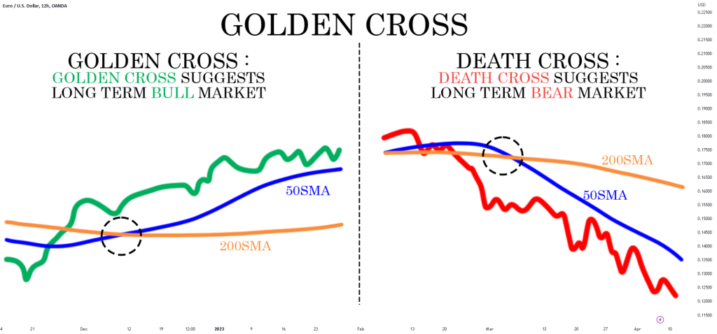 Sinyal Golden Cross terjadi ketika MA periode pendek memotong MA periode panjang dari bawah, yang menandakan potensi tren naik. Sebaliknya, Death Cross yang memotong dari atas menunjukkan potensi tren turun jangka panjang.