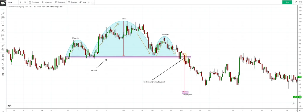 - Sinyal jual (Head and Shoulders atas): Penembusan neckline ke bawah menjadi sinyal distribusi.