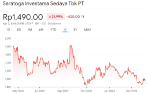 Emiten Perusahaan Holding & Investasi Saratoga Investama Sedaya Tbk menunjukkan kinerja yang menurun di tahun 2023. Emiten telah mencatatkan laba bersih Rp -10 Trilliun di tahun 2023. Laba tersebut menurun -319.4%dibandingkan dengan capaian tahun sebelumnya.