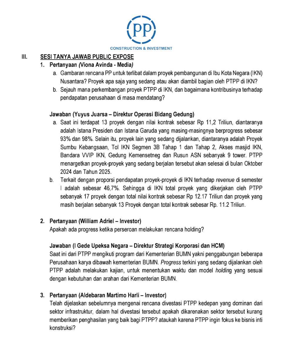 Pada Public Expose Live 2024 yang dilaksanakan pada 28 Agustus 2024, PT PP (Persero) Tbk memaparkan berbagai informasi terkait proyek yang sedang berjalan dan rencana strategis untuk masa depan. Acara ini dihadiri oleh 112 investor umum dan 28 media, menunjukkan antusiasme dan ketertarikan publik terhadap perkembangan perusahaan. Dalam sesi ini, manajemen menyoroti keterlibatan perusahaan dalam 13 proyek di Ibu Kota Negara (IKN) dengan nilai kontrak sebesar Rp 11,2 Triliun, termasuk proyek penting seperti Istana Presiden dan Istana Garuda yang masing-masing telah mencapai progres sebesar 93% dan 98%.Secara keseluruhan, terdapat 17 proyek di IKN dengan nilai kontrak total mencapai Rp 12,17 Triliun, dengan kontribusi proyek di IKN terhadap pendapatan semester I 2024 mencapai 46,7%