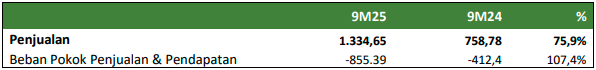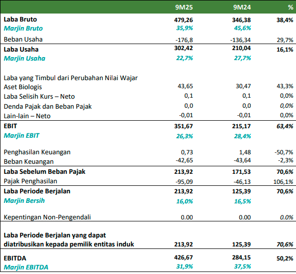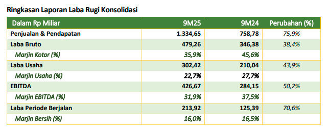 Pengelolaan yang baik ini membuat Perusahaan berhasil memperoleh laba kotor sebesar Rp479,26 miliar pada 9M25, mencerminkan peningkatan 38,4% dibandingkan Rp346,38 miliar pada 9M24, dengan marjin 35,9% pada 9M24, turun dari 45,6% pada 9M24. Pertumbuhan laba kotor terutama didukung oleh peningkatan penjualan yang berhasil diraih oleh Perusahaan.