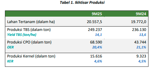 Efisiensi dan inovasi telah menghasilkan hasil yang positif, didukung dengan peningkatan penjualan serta penekanan pada biaya yang ketat. Perusahaan membukukan pendapatan sebesar Rp1,33 triliun, meningkat dari Rp758,78 miliar pada 9M24. Hal ini didorong oleh peningkatan produksi CPO dan Kernel yang sangat signifikan sehubungan dengan telah beroperasinya ketiga PKS Perusahaan serta peningkatan harga jual rata-rata yang lebih tinggi secara tahunan. Harga jual CPO meningkat sekitar 15,7% YoY pada 9M25, sedangkan harga jual TBS dan kernel juga naik masing-masing sebesar 24,3% dan 69,4% YoY.