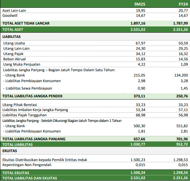 Total aset sebesar Rp2,53 triliun, dengan peningkatan signifikan pada cadangan kas sebesar Rp247,38 miliar, naik dari posisi pada 31 Desember 2024 sebesar Rp133,27 miliar. Total liabilitas perusahaan pada 9M25 mencapai Rp1,03 triliun dibandingkan dengan Rp952,72 miliar pada akhir 2024, sementara ekuitas mencapai Rp1,50 triliun, meningkat signifikan dari Rp1,29 triliun pada akhir 2024.