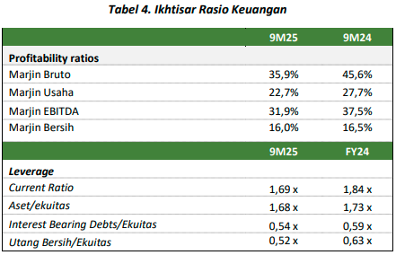 Pada tingkat laba bersih, perusahaan berhasil mempertahankan marjin bersih sebesar 16,0% pada 9M25, sedikit terkoreksi dari 16,5% di 9M24. Selain itu, rasio utang terhadap EBITDA tercatat sebesar 2,42x di 9M25, turun dari 3,35x pada akhir tahun lalu, sementara rasio utang bersih terhadap EBITDA tercatat di level 1,83x, cukup rendah dibandingkan 2,88x akhir tahun 2024.