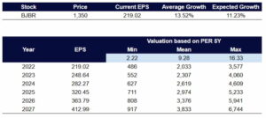 Dengan estimasi PER 9,28 maka harga wajar saham BJBR dapat dihargai senilai 2307 (sepertinya sulit akan tercapai di level ini jika tidak ada katalis fundamental yang signifikan).