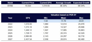 Dengan estimasi PBV 6,61 maka harga wajar saham BYAN dapat dihargai senilai 6.985.