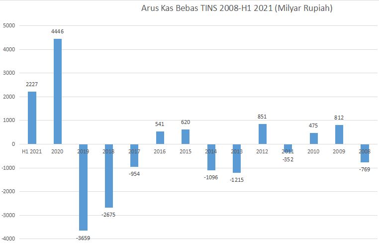 Ketika TINS mencapai ATH di 2008, arus kas bebas TINS malah minus 769 milyar rupiah.