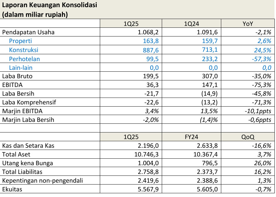 dibandingkan Rp307,0 miliar pada 1Q24. SSIA mencatat EBITDA sebesar Rp36,3 miliar pada 1Q25, turun dari Rp147,1 miliar pada 1Q24. Penurunan ini terutama disebabkan penurunan kinerja pada segmen perhotelan akibat aktivitas renovasi yang sedang berlangsung. EBITDA segmen ini turun sebesar Rp90,0 miliar secara tahunan. Perseroan membukukan rugi bersih konsolidasian sebesar Rp21,7 miliar pada 1Q25, dibandingkan rugi bersih sebesar Rp14,9 miliar pada periode yang sama tahun sebelumnya.
