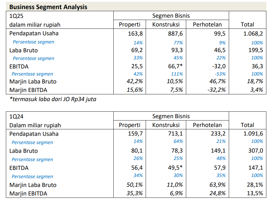 menjadi Rp887,6 miliar. Sementara pendapatan dari segmen perhotelan tercatat sebesar Rp99,6 miliar, turun 57,3% secara tahunan. Hal ini disebabkan oleh adanya penutupan sementara Hotel Melia Bali untuk renovasi yang dimulai pada Oktober 2024.