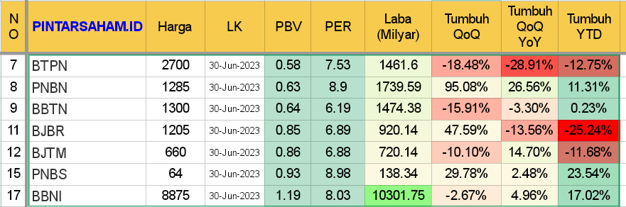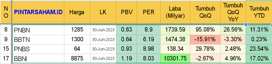 Hanya PNBN PNBS BBTN dan BBNI yang labanya tetap tumbuh di 2023 dan valuasinya masih murah secara PBV dan PER.